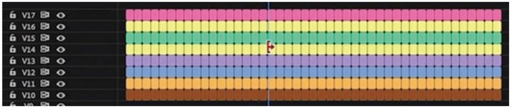 ポストプロダクションの環境などでは、[ソースクリップ名とラベルを表示]というコマンドが有効になっている場合があります。するとPrmiereのタイムラインでは、同一のクリップは同じラベルカラーで表示されます。ただ、同一のクリップが見分けやすいというメリットがあるものの、エフェクトを適用済みのクリップや、追加の編集が必要なクリップなどを色分けして区別しやすくすることはできません。