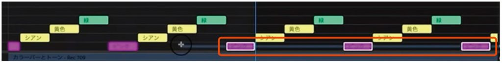 1: [ソースクリップ名とラベルを表示]が有効だと、タイムライン上の同一のクリップが同じラベルカラーで表示される。