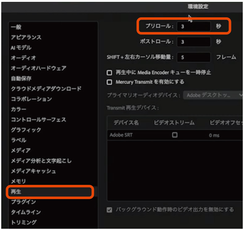 プリロールの秒数は、[環境設定]ダイアログの[再生]→[プリロール]で設定できます。一度のプリロールで再生ヘッドから戻りたい秒数を指定しましょう。