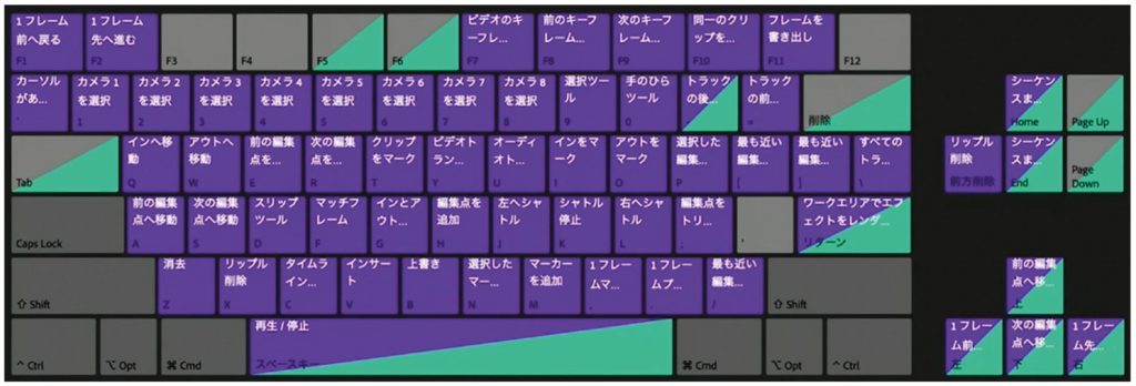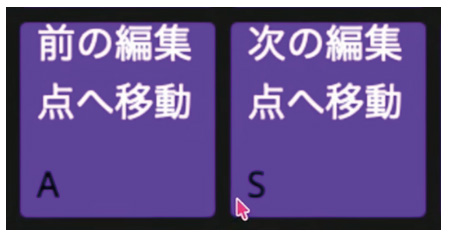 ショートカットキーについては、作業内容によって使わないものもありますが、基本的にほとんどのキーにショートカットを割り当てています。特徴としては、[A]と[S]によく使う「前の編集点へ移動」「次の編集点へ移動」などを仕込んでいて、マウスを持ちながら左手ですぐ移動できるような配置にしています。逆に、「最も近い編集点をトリミングアウト」「最も近い編集点をトリミングイン」などは、右手で押せるキーに配置にしており、マウスを触らずに動画の尺を調整する際などに使用しています。