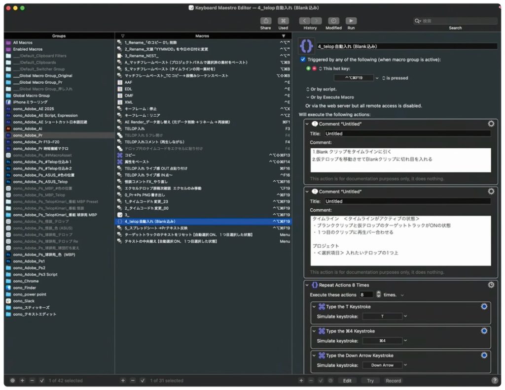 [Control+E]のショートカットキーには、形式ごとのファイル書き出しを登録している。Premiere上では、同じキーに複数項目を登録することはできないが、Keyboard Maestroで登録すれば可能。例えば、OMFで出力したいときは[Control + E]を押して、頭文字に設定した「O」を押せばマクロが実行される。