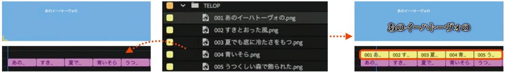 以下の手順のように、「タイムラインで検索」機能を活用することで、タイプ違いの映像に対して、同じ位置にテロップやSEを素早く配置することが可能になります。