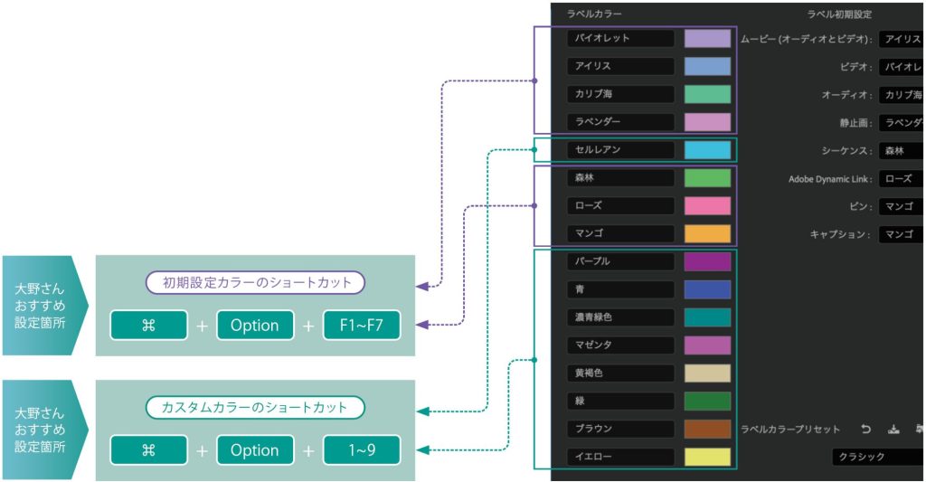 Premiereで動画や静止画を読み込んだ際にラベルカラーが初期設定のままだと、テロップなどを多く入れたときに全て同じ色になってしまったりして、分かりづらいんですよね。なので、初期設定のカラーだけでなく、「カスタムカラー」もショートカットキーに設定しています。ショートカットキーの割り当ては、初期設定で使われているカラーを[Command +Option+F1〜F7]、色の被らないカスタムカラーのほうを[Command+Option+1〜9]にそれぞれ割り当て、その都度変更しています。