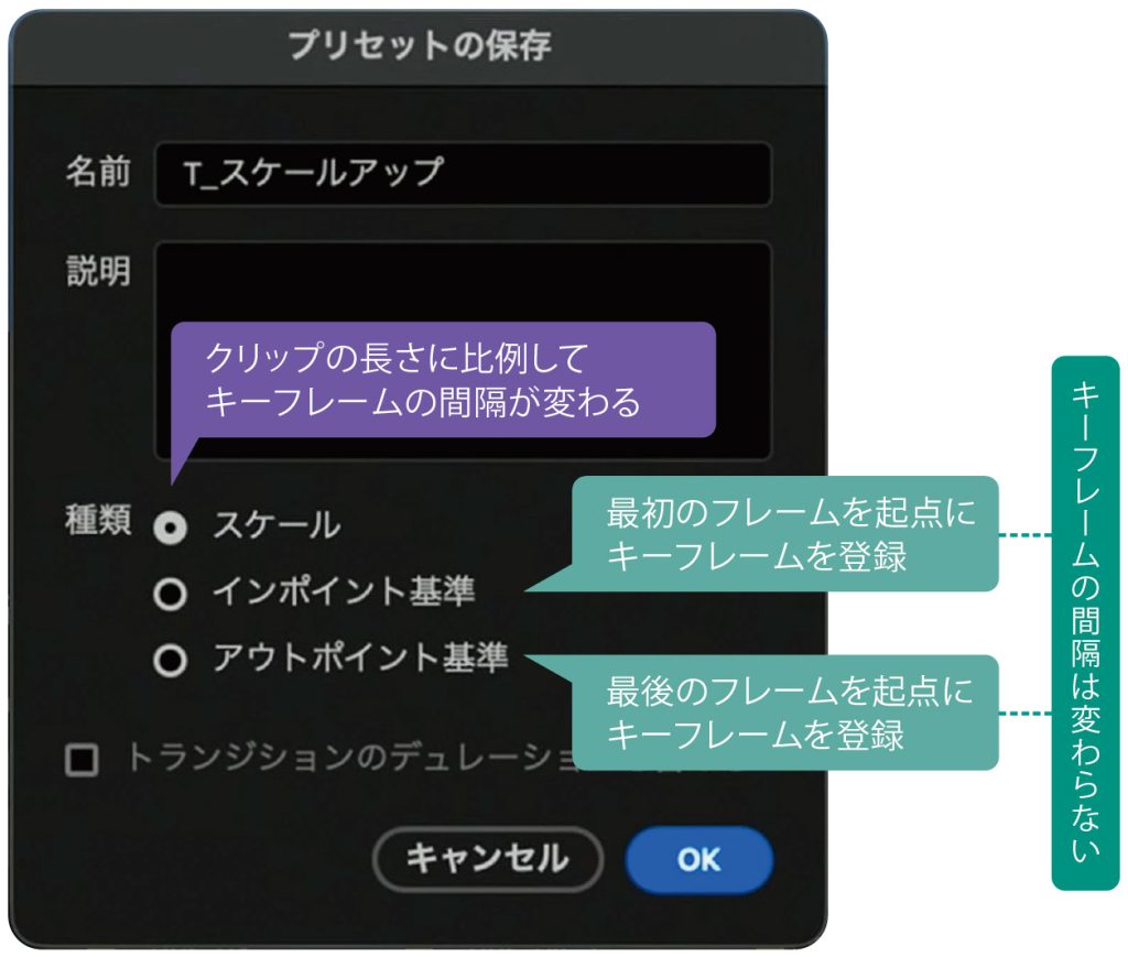 また、登録する際はモーションの内容に応じて、右図にある[種類]の項目を選択することでキーフレームの間隔やどこを起点にするかが変わります。