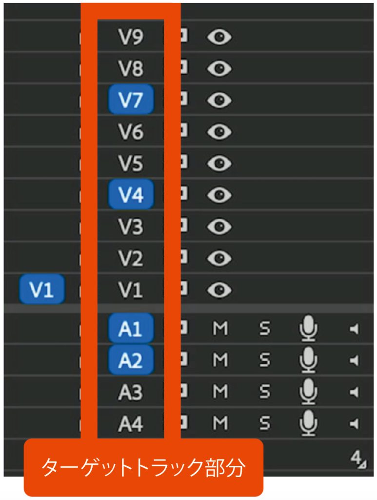 タイムラインを整理する際、ターゲットトラックを活用すると便利です。ターゲットトラックとは、タイムライン上で素材の貼り付け先や編集の対象となるトラックを指定する機能です。
