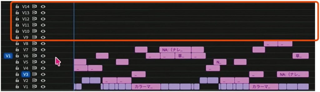 例えば、仮テロップやナレーションの原稿があちこちに入った状態のシーケンスがあるとします。シーケンスを整理する際は、最初にタイムラインのトラック数を増やしておき、仮テロップ用のトラック、ナレーション原稿用のトラックなど、カテゴリ別に更にトラックを追加します。