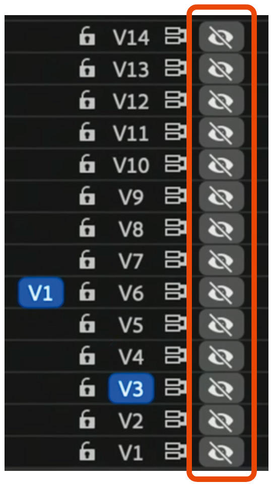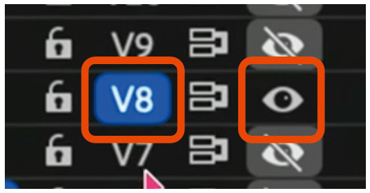 次に、一旦全てのトラックを非表示にし、整理したいトラックのみを表示して、ターゲットトラックをオンにします。そうすることで指定したトラックにあるクリップだけを確認することができます。