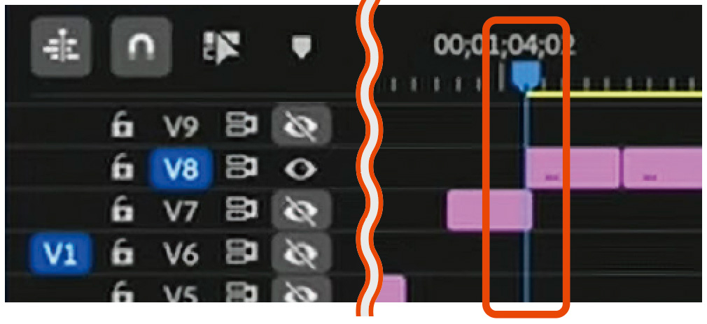 「前/次の編集点へ移動」のショートカットを使い、再生バーの編集点を移動させると、V8トラックのクリップを順に見ることができるので、確認しながらテロップを仕分けていく。