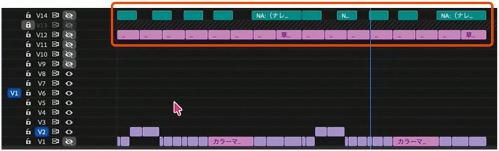 ここではV14をナレーションの仮テロップ、V12をテロップに。トラックをロックすると斜線が表示される機能を利用し、V13をロックして区切り用のトラックにしている。