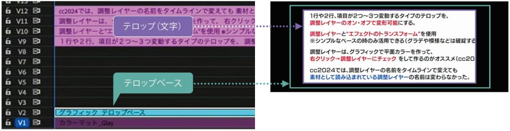 テロップを配置し、テロップの下にテロップベースを敷く。(テロップベースがグラデーションや模様になっているものは破綻してしまうため、シンプルなベースのみ活用可能)。