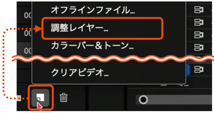 プロジェクトパネル右下にある「新規項目」アイコンをクリックし、「調整レイヤー」を選択。設定は変更せずに「OK」をクリックすると、プロジェクトパネル内に「調整レイヤー」が作成される。