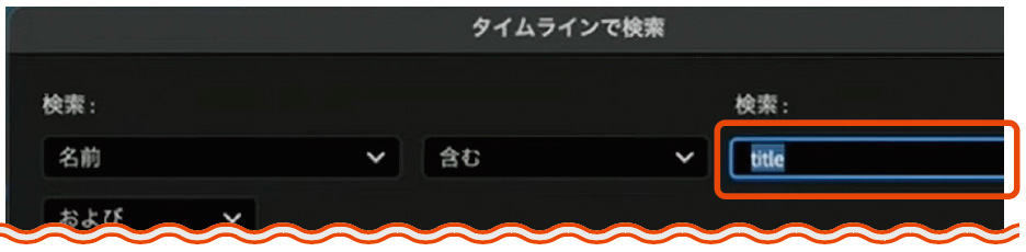 「タイムラインで検索」[⌘+F]を開き、検索したい文字(ここでは「title」)を入力。検索をクリックすると、「title」の文字が入ったテロップクリップに飛ぶ。