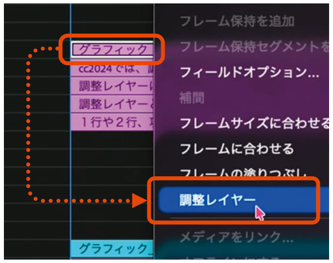そのため、調整レイヤーはシーケンスと同じサイズの長方形の平面をグラフィックで作り、グラフィックレイヤーを右クリック>「調整レイヤー」を選択(左図)して作成するのがおすすめ。