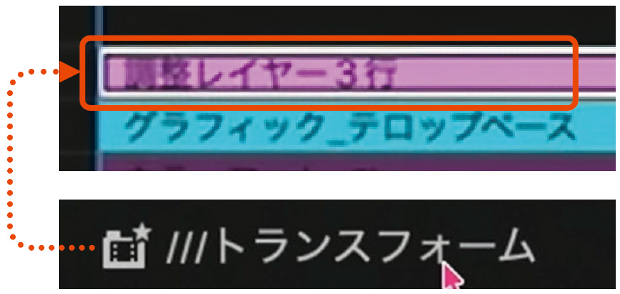 作成した調整レイヤーの名前を変更し、テロップベースの上に配置。「トランスフォーム」エフェクトを適用する。
