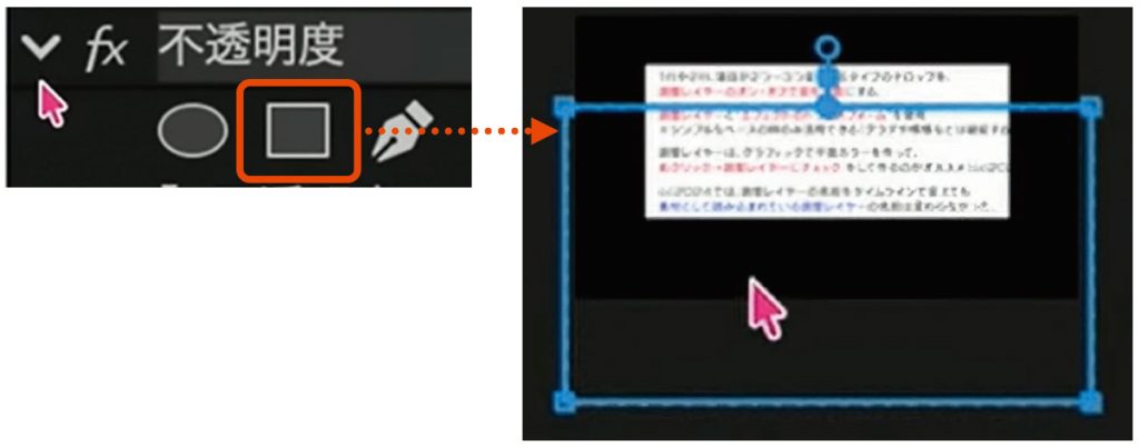 調整レイヤーの不透明度内にある四角アイコンをクリックすると、長方形マスクが作成されるので、[Shift]キーを押しながら拡大し、テロップベースの下半分を覆い隠す状態(右図)にする。