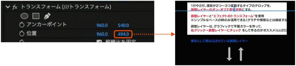 トランスフォームの位置(Y座標)を動かすと、テロップベースの下部分だけが伸び縮みするようになる。文章が3ブロック分表示される位置に調整する。