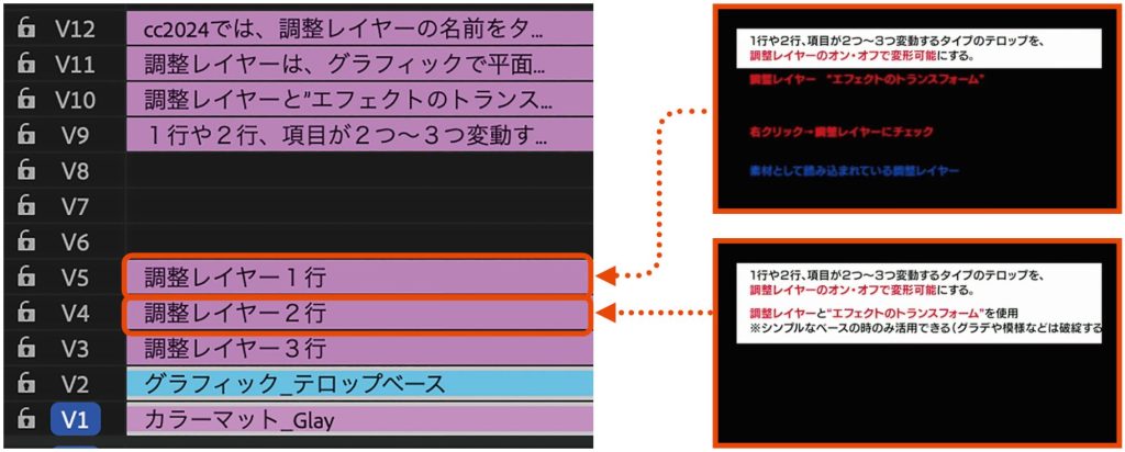 調整レイヤーは、下に敷いた複数のレイヤー全体に影響するもので、色調補正やエフェクトを一括で適用できる透明なレイヤーのことです。調整レイヤーを上手に活用することで、テロップの行数や複数あるような項目をオン・オフで容易に変形することが可能になります。