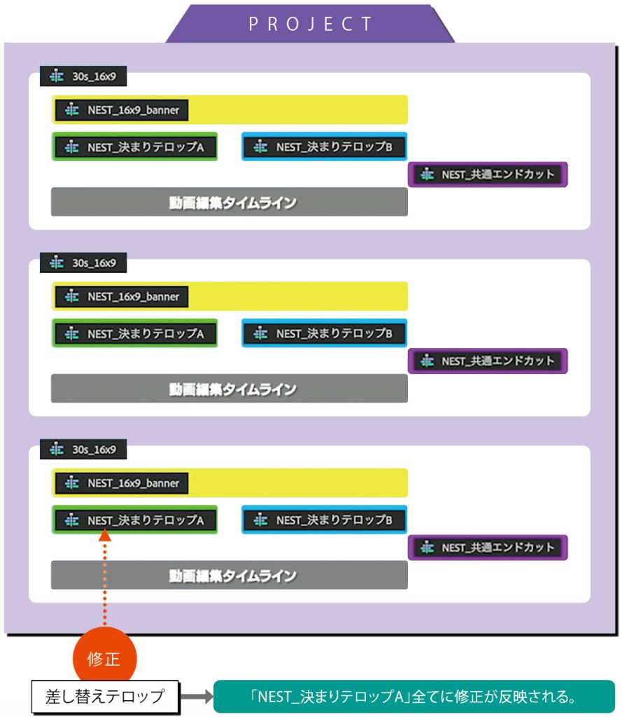 例えば、右図のようにお決まりのテロップや毎回使われるバナー、エンドカットなどがある動画の場合、共通の部分をそれぞれネスト化することで、同じ色のシーケンスの中身をひとつだけ修正すれば、他の同じ色のシーケンスにもまとめて修正を反映させることが可能になります。