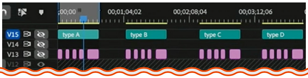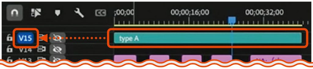 シーケンスの最上部にグラフィック(内部のシェイプを消しているため空のレイヤーのような状態)を配置し、タイプごとに「typeA」「typeB」などの名前をつけ、ターゲットトラックを指定する(上図では、typeAのあるV15のみターゲットトラックをオンにしている)。