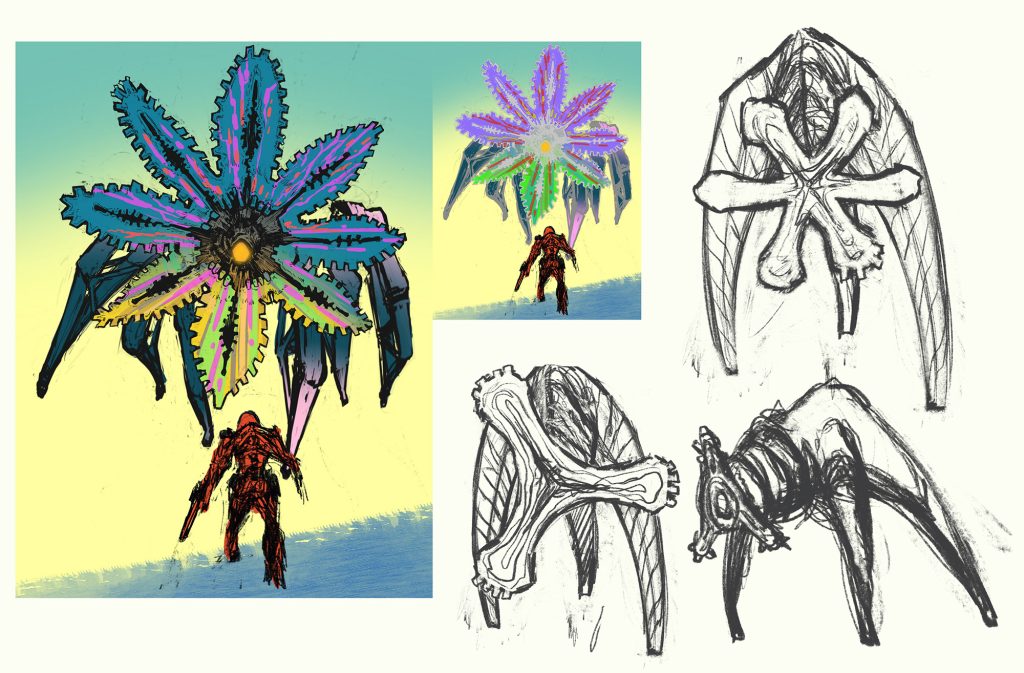 プリプロ段階では、設定やデザインに説得力をもたせるため、多岐にわたるリサーチを行います。ダロルの造形を考える際には、植物型バイオボットを研究する方の著書や研究動画を参考にしました。植物にヒントを得たロボットという発想自体も面白く、造形物としても大いに刺激を受けました。