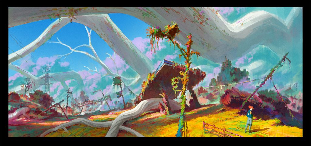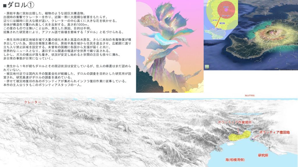 本作のオリジナル要素である「ダロル」とは、異星人が地球に送り込んだ巨大な花です。正確には、侵略対象の星をテラフォーミングする植物型バイオボットという設定で、原作の「ギタイ」から大きなインスピレーションを得ています。プロジェクトの最初期に、ダロルのイメージを描けたことで、作品の方向性が固まっていきました。