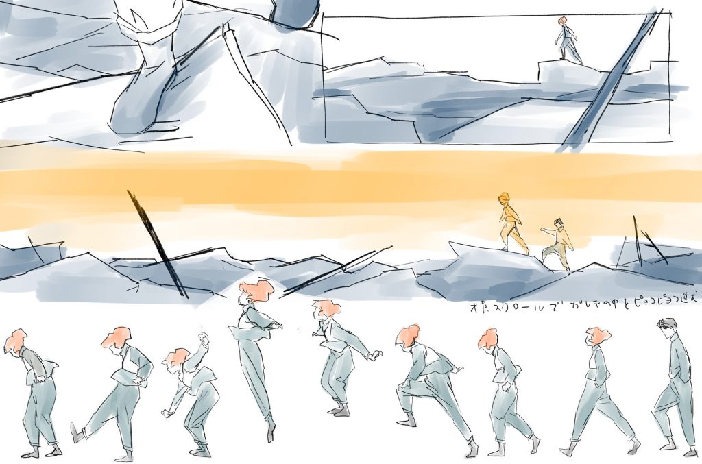 映画の全編を3DCGアニメーションをベースに作ることは、自分たちにとって大きな挑戦でした。最初に決めたのは、ワークフローと表現様式のどちらもこれまでSTUDIO4℃が培ってきた作画のリミテッドアニメを踏襲することでした。そこでまずは、アニメーションディレクターを務めていただいた中島智成さんに、村上さんのイメージボードを参考に「歩く、走る」等の動き、「笑う、怒る」といった表情などのテストアニメーションを作ってもらいました。この段階から手応えを感じていたので、アクションやギタイなど、さまざまな動きの方向性を見定めていきました。