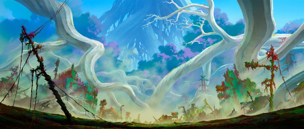 映画の土台となる背景美術は、美術監督の久保さんをはじめとする美術スタッフの方々の素晴らしい仕事によって描かれています。 久保さんとは世界観設定のラフを元にお互い集めた写真資料や画集などを見ながら、 表現手法やコンセプトを試行錯誤しました。 特にリタの闘いの場となるダロルに浸食されたエリアは、 この世に存在しない景色を創造する必要があったので久保さんのクリエイティブが本当に心の支えでした。 ねばり強く取り組んでいただいた甲斐あって美しさと怖さを兼ね備え、 そして主人公リタの心を反映した素晴らしい美術が生まれました。