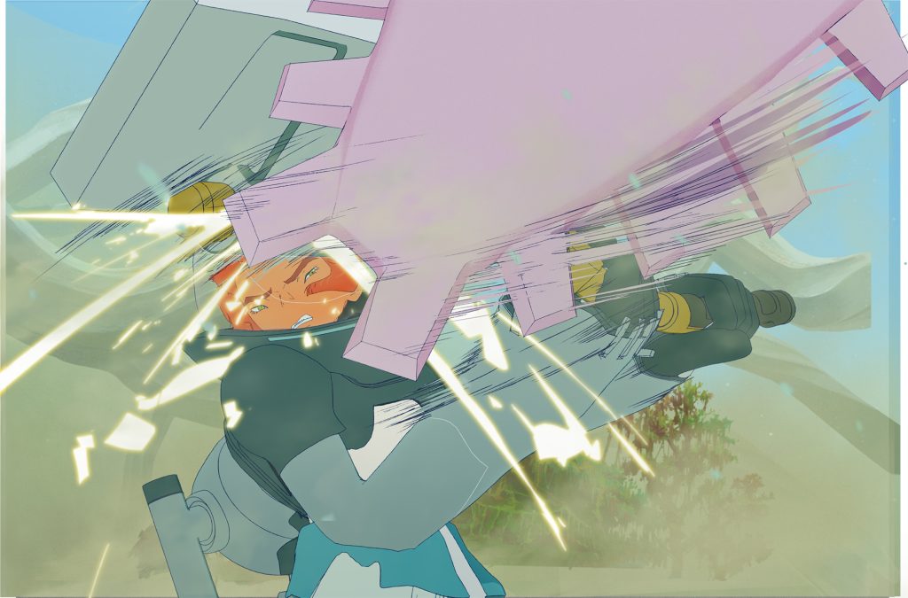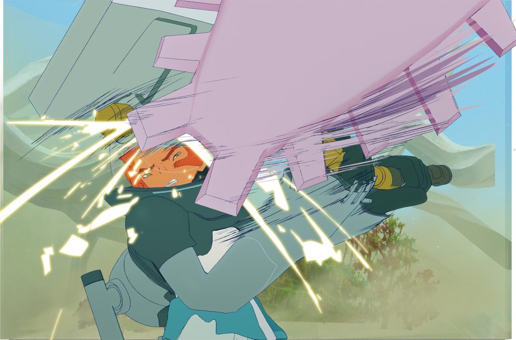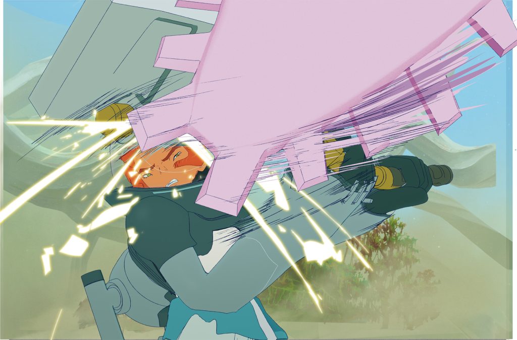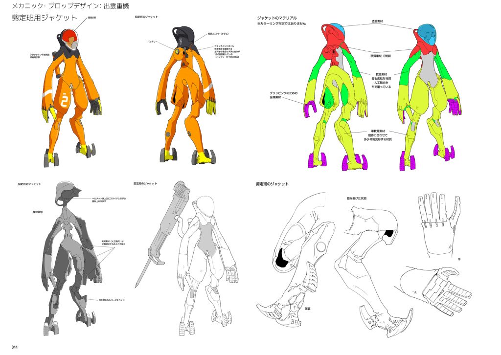 メカ類のデザインは、出雲重機さんにご担当いただきました。 どのデザインもしっかりとした考察に基づいたコンセプトと遊び心がバランスよく織り交ざって成り立っています。中でも、 リタたちが装着する「機動ジャケット」は、 アニメーションさせる上で映える機能やギミックを盛り込んでいただきました。