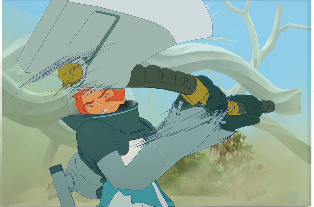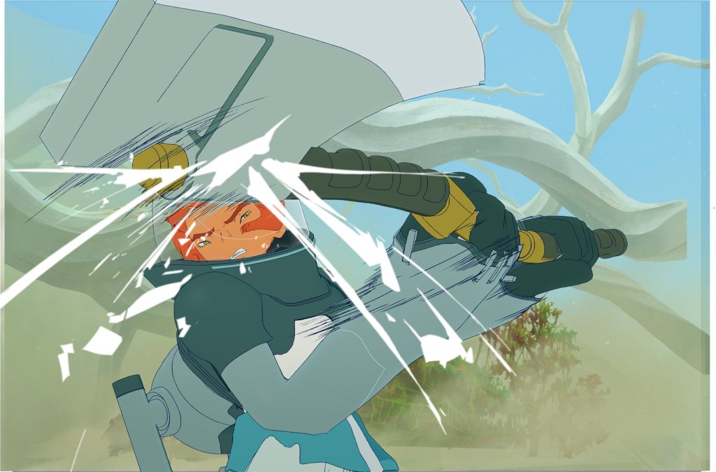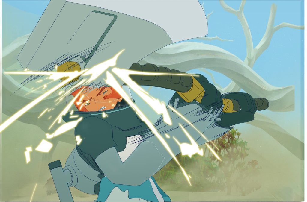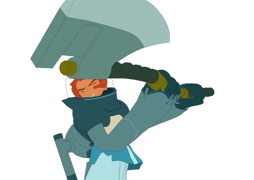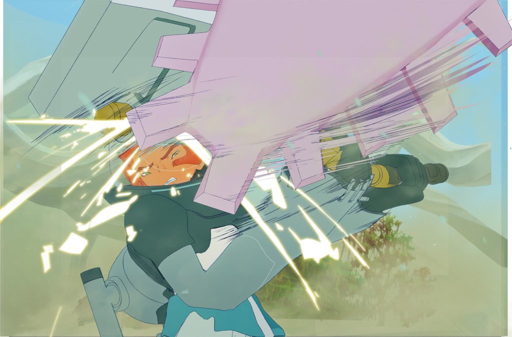 メカ類のデザインは、出雲重機さんにご担当いただきました。 どのデザインもしっかりとした考察に基づいたコンセプトと遊び心がバランスよく織り交ざって成り立っています。中でも、 リタたちが装着する「機動ジャケット」は、 アニメーションさせる上で映える機能やギミックを盛り込んでいただきました。