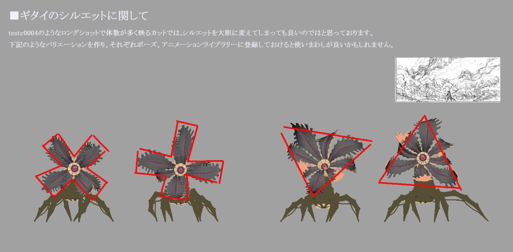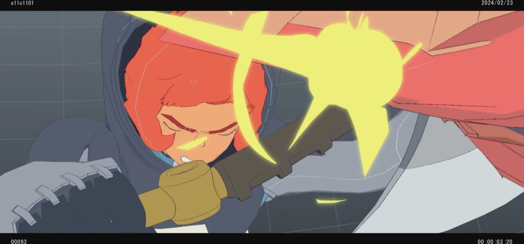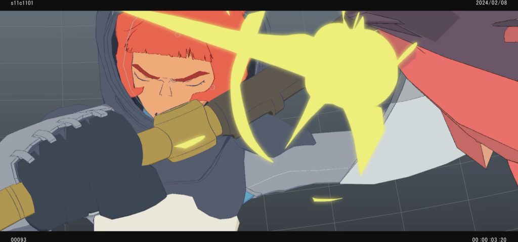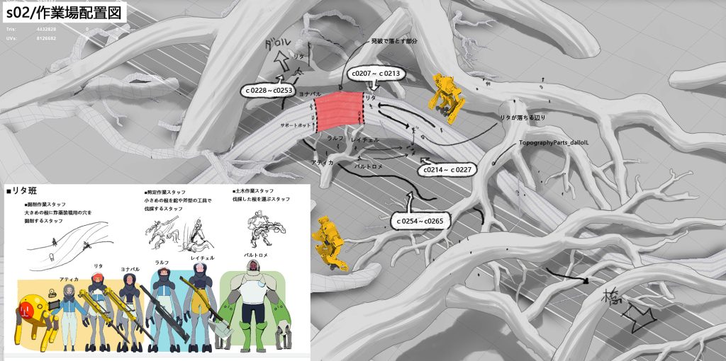 上図のほか、途中段階のCGアニメーションに対して、表情のブラッシュアップなどを作画監督の笠原由博氏が参考として描き入れた資料も用意された。 各フレームで押さえるべき重要なポイントを具体化できたことで、CGアニメーションを一定の水準に保つことができたという。