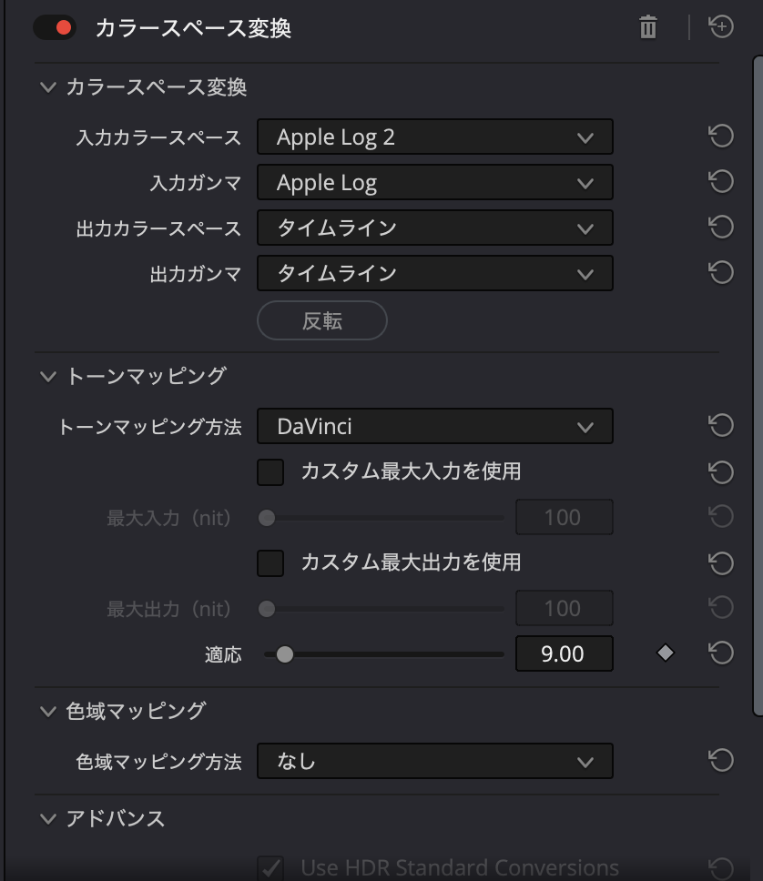 DaVinci Resolveのエフェクトからカラースペース変換を使用。