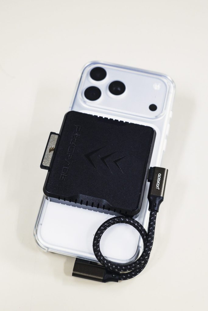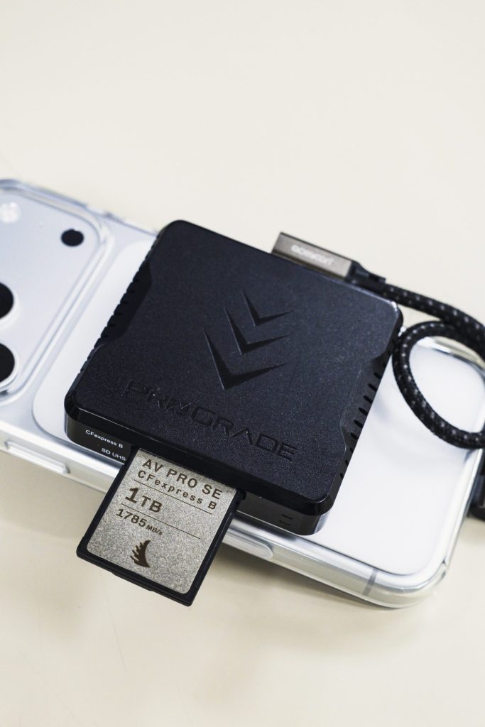 注意点として、ProRes RAW以上の動画を撮影したい場合は本体のUSB-C 端子からSSD 等の外部ストレージに記録することが必須となります。内部ストレージが潤沢とは限らないことや、RAWを内部に収録する際の発熱等を考えてのことかもと思いましたが、今回ちょっとした実験をしてみました。それは「充分に高速なメディアならカードリーダー経由で収録できるのでは?」というもの。実験にはProGradeのカードリーダーおよびAngelBird 製のCFexpress Type Bを使用。アプリから保存先に指定したところ、全く問題なく収録することができました。ただし、カードに他のデータが入ったままだったりするとフリーズすることがあるため、使用の際には必ずCFexpressをiPhone純正の「ファイル」アプリでフォーマットを行うのが良いでしょう。