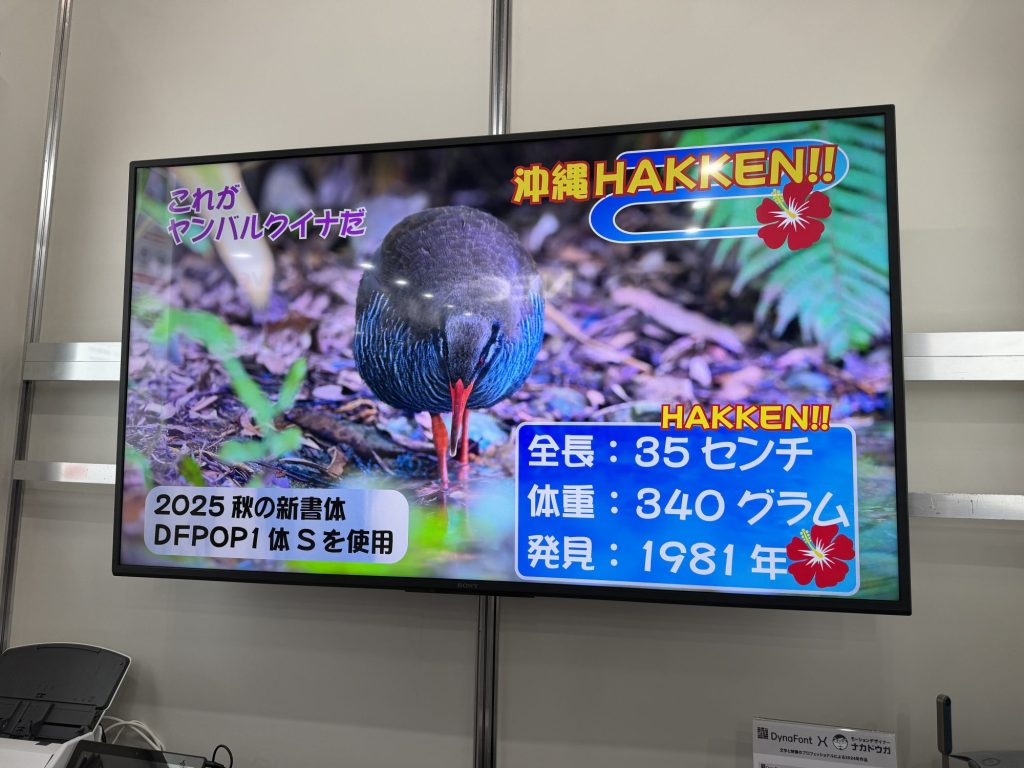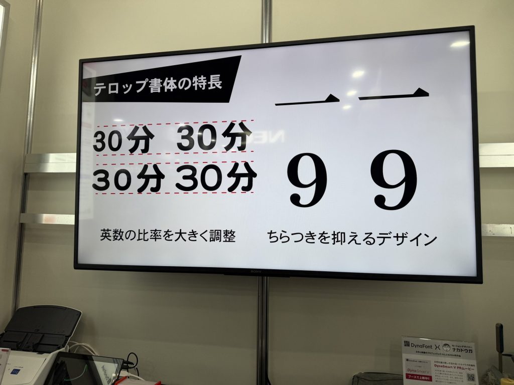 ダイナコムウェアブースでの注目は、「テロップ書体」シリーズ。このシリーズは、液晶画面のあらゆるサイズでの表示において読みやすくなるよう再設計された書体群。アップデートされたテロップ書体に切り替えることで、通常は小さく作られている「英語と数字」の大きさが揃うよう調整されており、テロップの視認性が向上します。