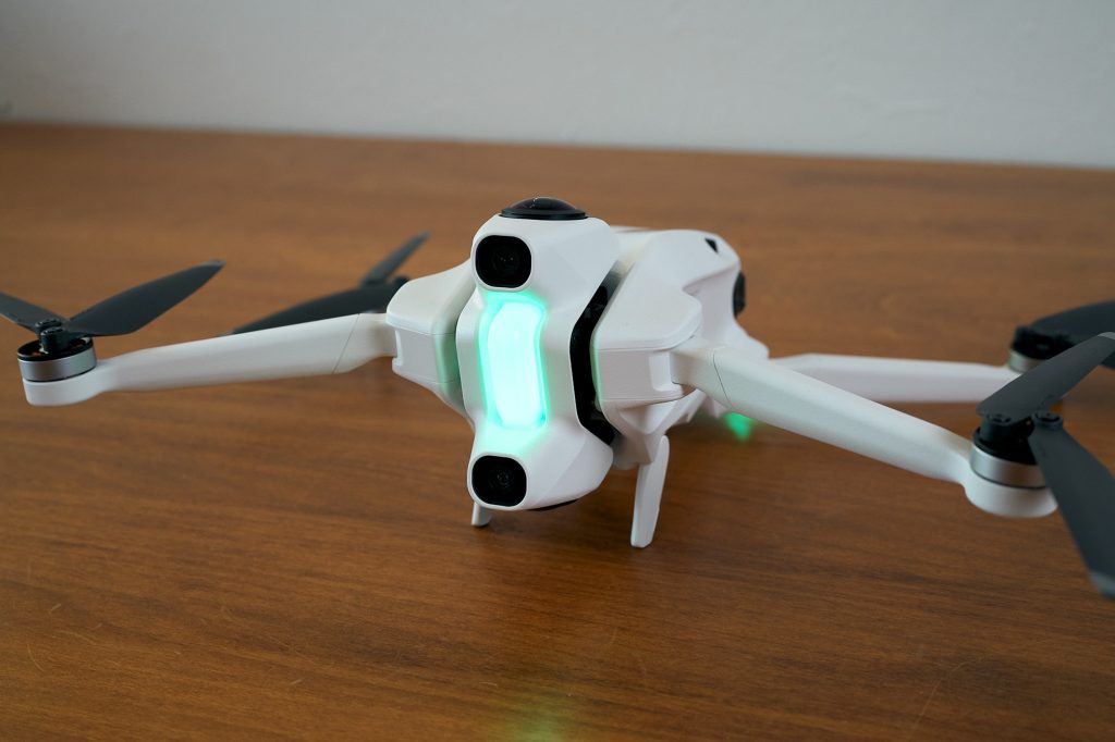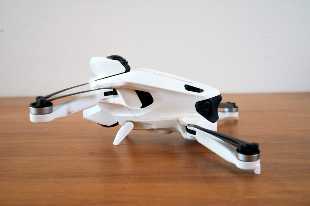 本体は、360度カメラを搭載している関係で、離陸時に自動で脚が展開する独自構造が採用されています。一点注意したいのは、地面に置く前に必ず脚を手動で、足を立てておく必要があることです。脚を展開しないまま地面に置くと、レンズが直接地面に接触してしまい、傷の原因になります。360度カメラという特性上、ここは特に気をつけたいポイントです。