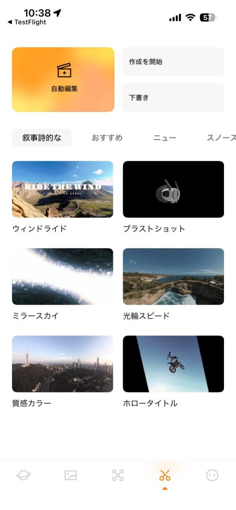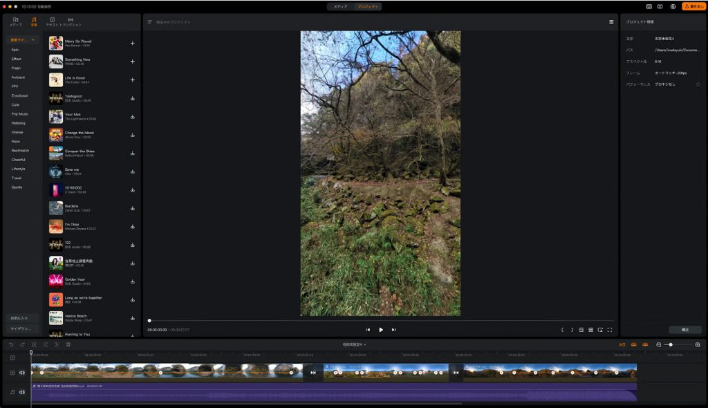1と2は純正ソフトということもあり、素材を取り込むだけでAIによる自動カメラワークやシーンに合ったテンプレート生成といった“半自動編集”も可能です。360度素材特有の重さを感じず、SNS向けショート動画までスムーズに完結できます。もちろん1、2いずれも手動でカメラワークを細かく設定し、通常の横長動画としてエクスポートしてから、PremiereやDaVinci Resolveに取り込んで本格編集することも可能です。