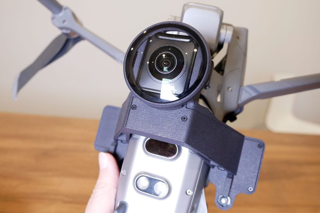 また、写真では伝わりにくいのですが、360度カメラは固定されているように見えて、実際にはゴム製のダンパーによって浮いてマウントされています。これにより飛行時の微細な振動を吸収し、360度映像の安定性を確保する仕組みになっています。見た目からは想像できない“しなり”があり、この設計は非常に興味深い部分でした。