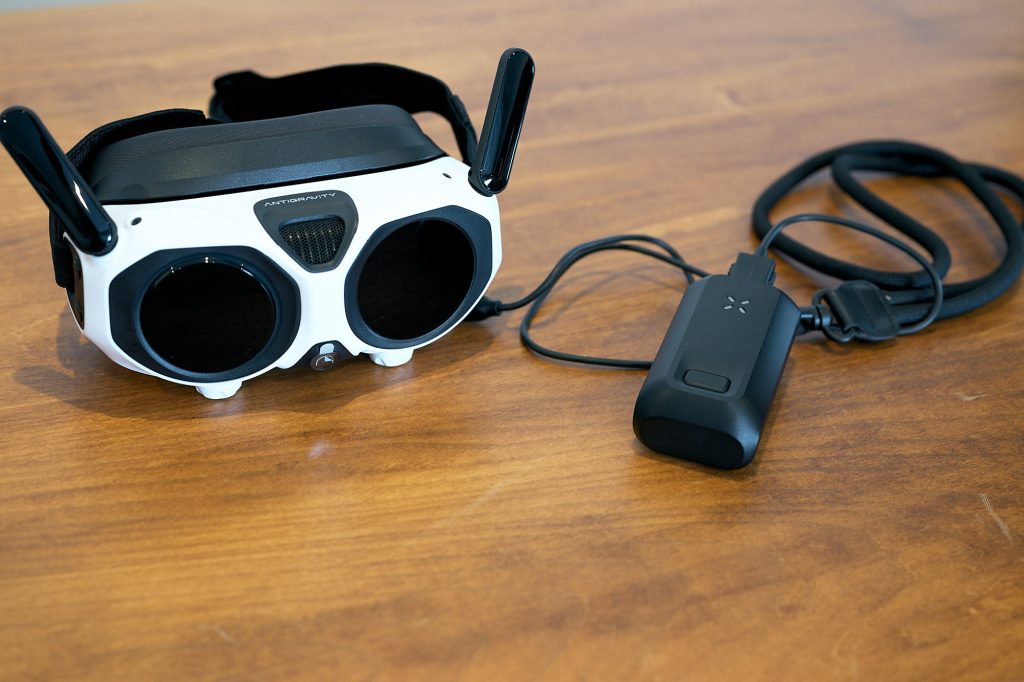バッテリーは外付けで、首からストラップで下げる仕様になっています。ケーブルが邪魔に感じる場面はあるものの、頭部に重さが集中しないため、ゴーグル本体が軽く保たれるという大きなメリットがあります。長いフライトでも首や顔への負担が少ないのは好印象でした。