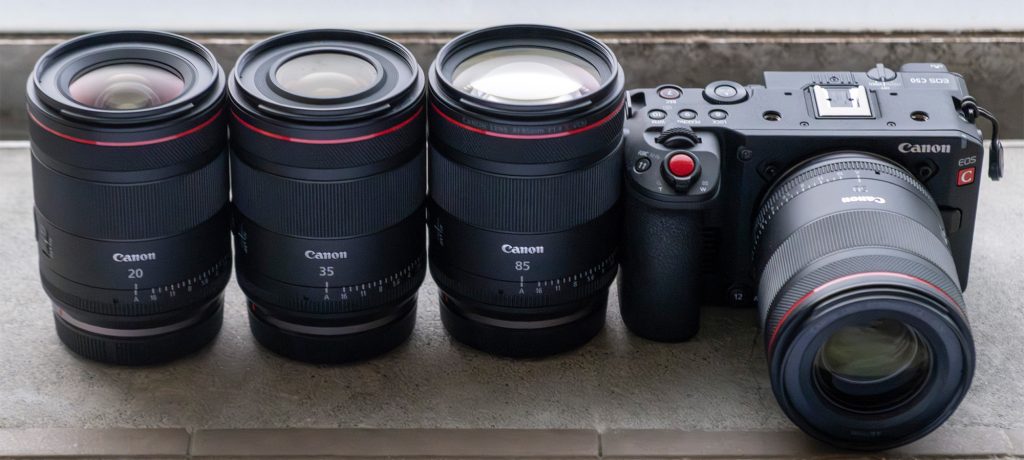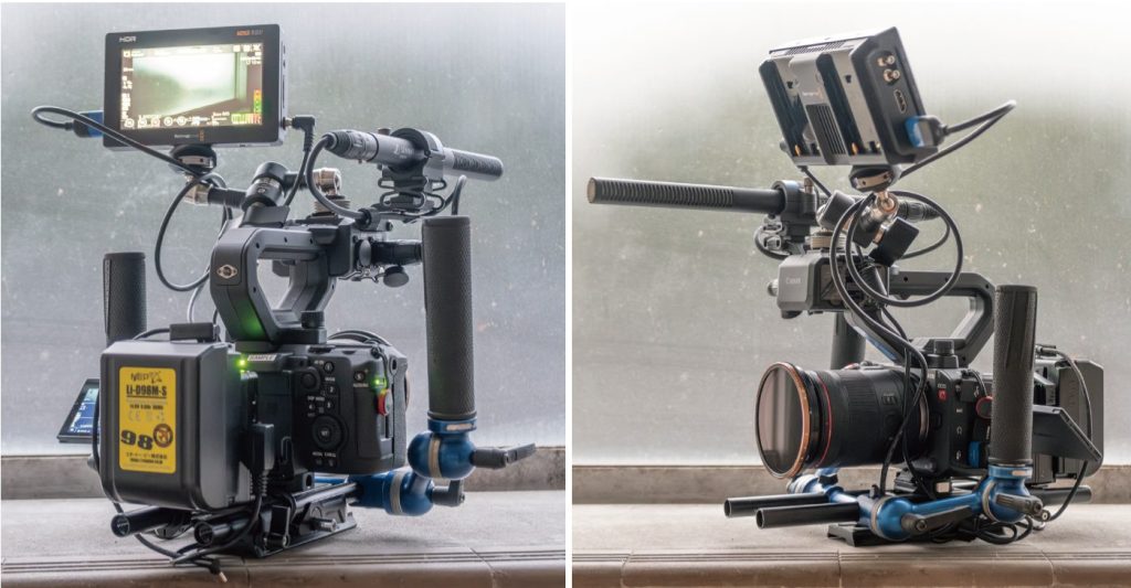 レンズは重量や重心バランス、フィルター径を統一して設計しているRF F1.4 L VCMシリーズ。20、35、50、85mmを使用。リグも必要最小限の構成。付属のトップハンドルは活かし、モニターはブラックマジックデザインのVideo Assistを使用。ガンマイクはゼンハイザーMKE600。バッテリーはNEP Li-D98M-SからUSB-Cでカメラに電源供給している。