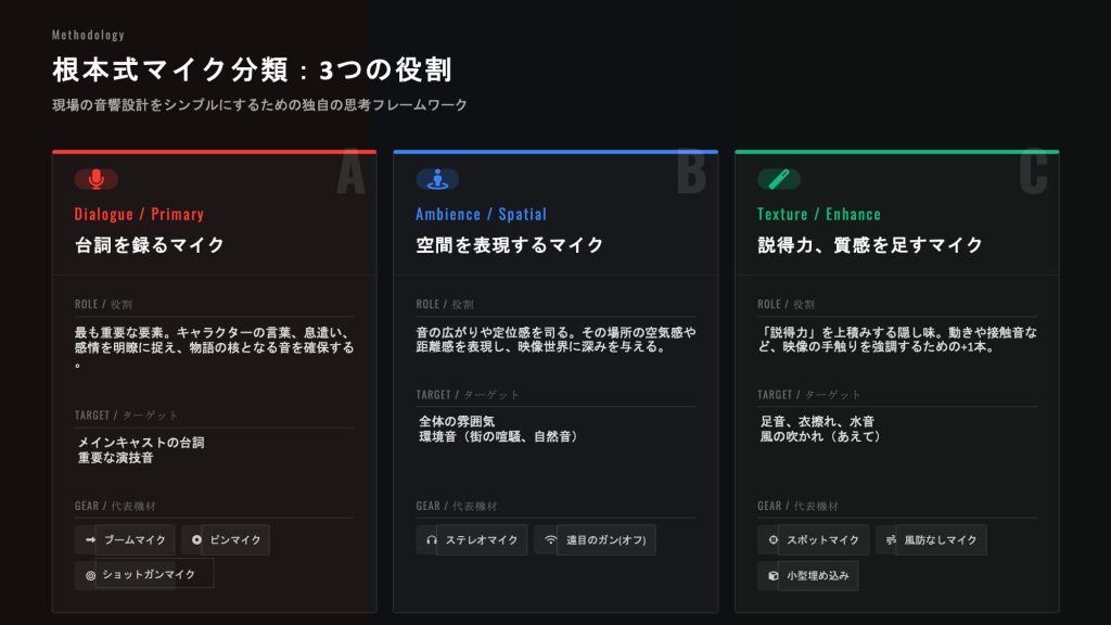 Cは、フレームの内側の説得力を上げるマイクで、ざっくり言えば後で効果音で足すような音も現場で録っちゃえ、という考え方です。