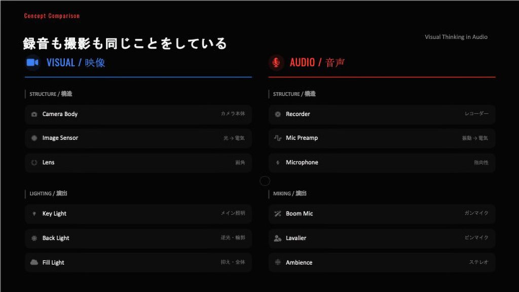 なので、ビデオグラファーさんみたいにカメラにマイクを付けたりしながら、色々なことをやりつつ「自分で音を録らなきゃいけない」方向けに、「こういう考え方で音にアプローチしていけば、作品が少し豊かになるかもしれない」という切り口で話をしたいなと思っています。