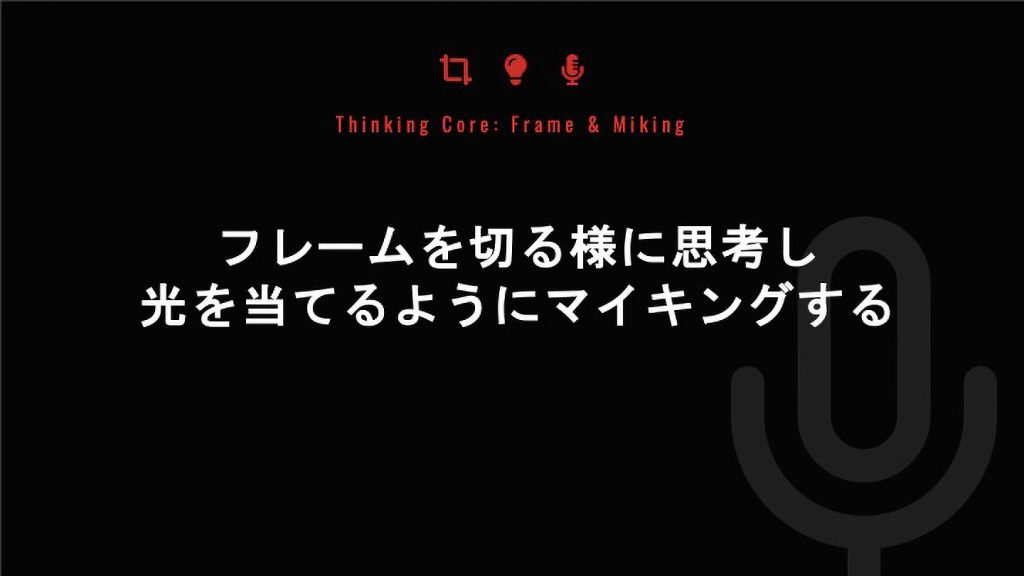 つまり、フレームを切るように考えて、光を当てるようにマイキングをしていく。この考え方で現場録音をしませんか、というのが今日伝えたいことです。