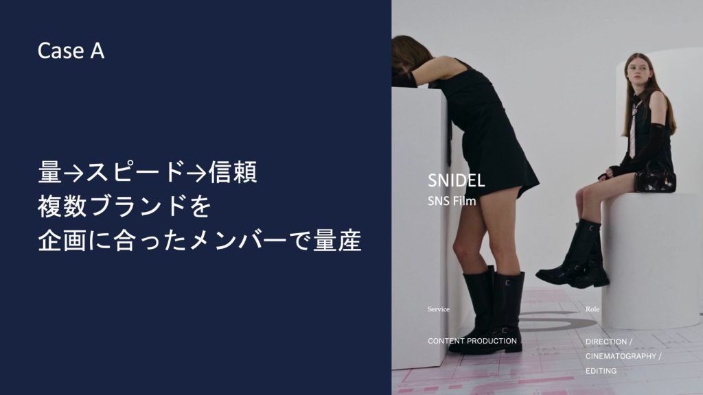 例えばアパレルブランドのSNIDELさんの案件では、一回の撮影で動画を5本作ることもあります。