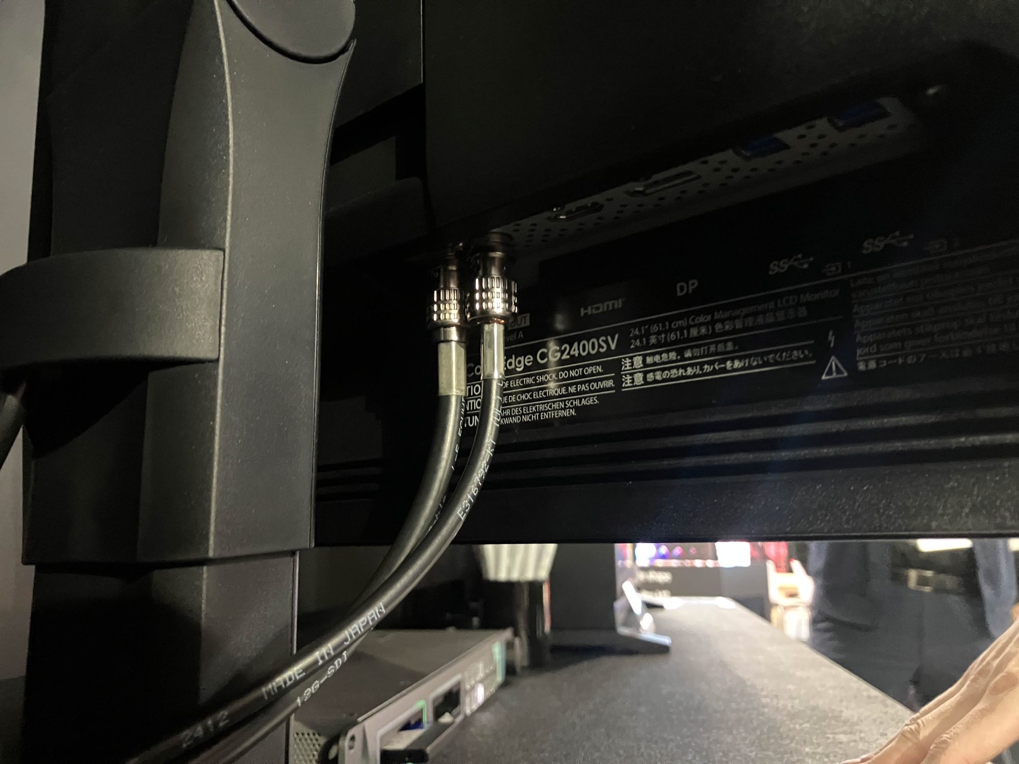 撮影現場でSDI出力端子を備えた撮影カメラと直接接続して撮影映像をプレビューする場合や、放送局で複数台のモニターを並べて放送映像をリファレンスする場合に、SDIコンバータを介さないシンプルな構成で接続できる「ColorEdge CG2400SV」。後ろには持ち運びがしやすい背面ハンドルが付いており、撮影現場での利便性を考えてデザインがなされていることがよく分かる。