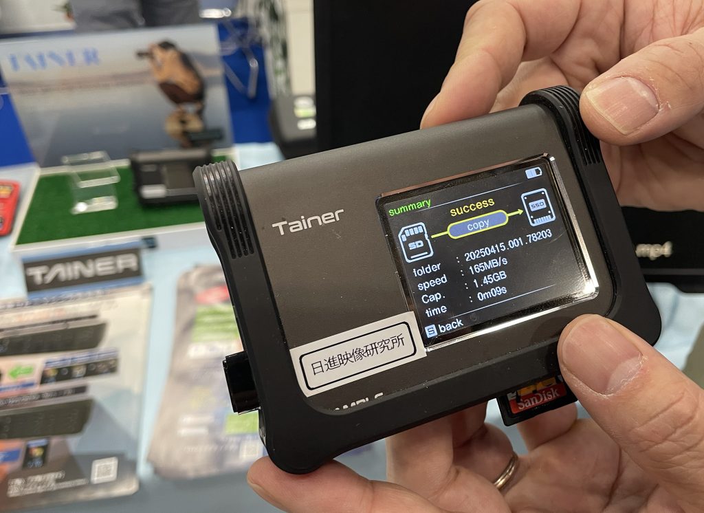 日進映像研究所ブースでは高速メディアバックアップシステムを紹介していた。こちらは2TBのSSDを内蔵し、SDカードを挿してそのままコピーしてバックアップをとることができるもの。バックアップしたものはWi-Fiまたは有線LAN経由でクラウドへデータを転送可能。
