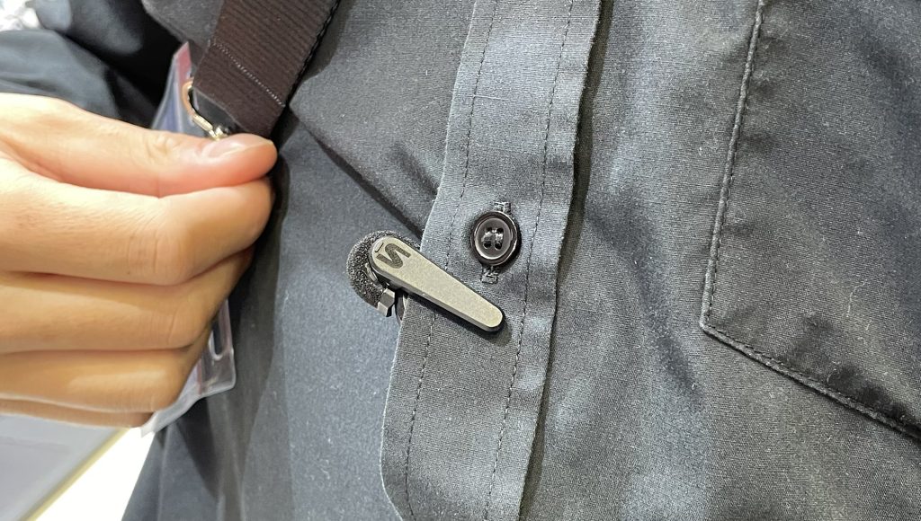 この手のマイクは大きめで四角いマイクの製品もあるが、MOEMICは、このように目立たないように装着することができ、非常に軽量なので、衣類がよじれることがない。