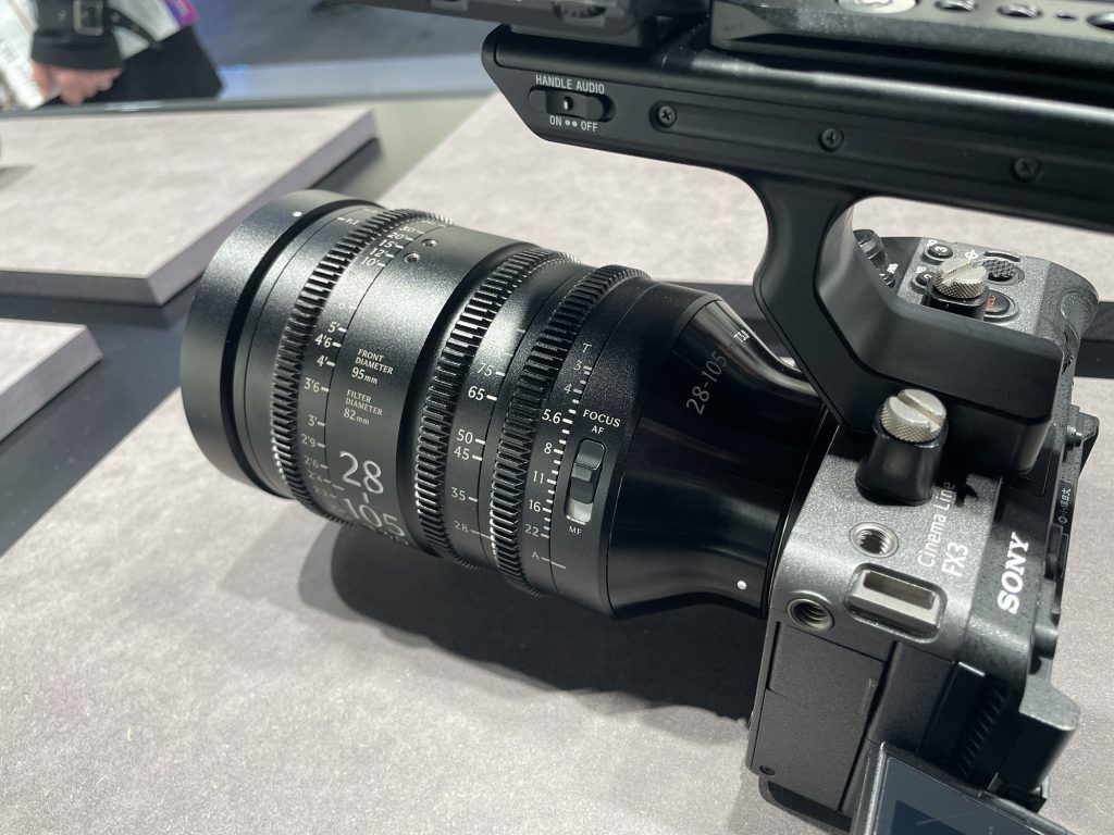 「Sigma Cine Lens」の新たなラインアップ「AF Cine Line」としてSigma 28-45mm T2 FF、Sigma 28-105mm T3 FFの2本を6月に発表。対応マウントはL マウント、ソニー E マウントで、ソニーFX3で試せるようになっていた。