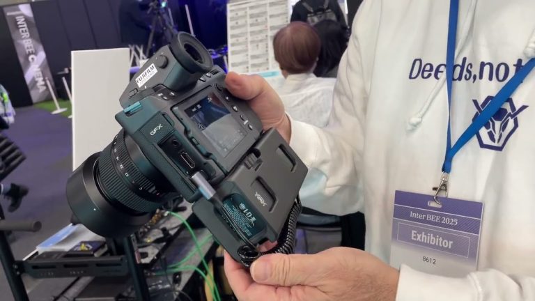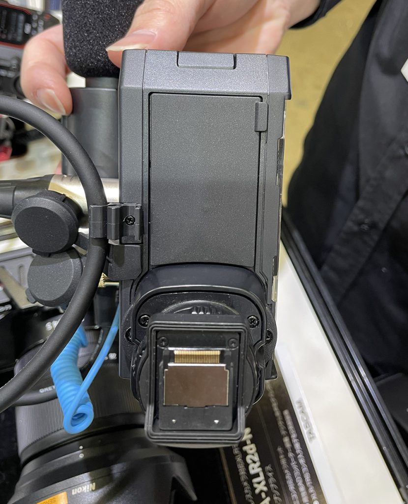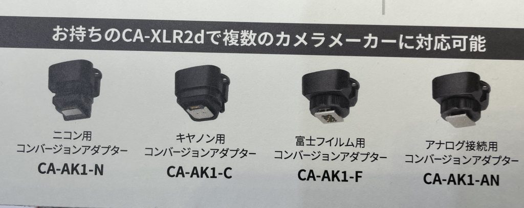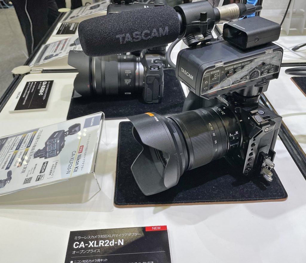 TASCAMでは各メーカー用のXLRマイクアダプターを用意しているが、Nikon ZRの発売に合わせて、ZRのデータ通信に対応したアクセサリーシュー経由でデジタル音声を伝送できるマイクアダプターを発売し、組み合わせて展示していた。CA-XLR2d-N。これまでニコンにはデジタルインターフェイスがなく、アナログ接続のものを使用するしかなかったが、この組み合わせであればデジタル音声伝送に対応できるだけでなく、カメラからの給電にも対応する。