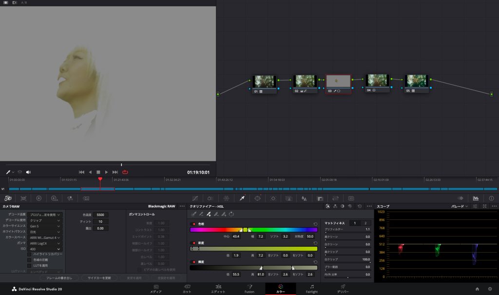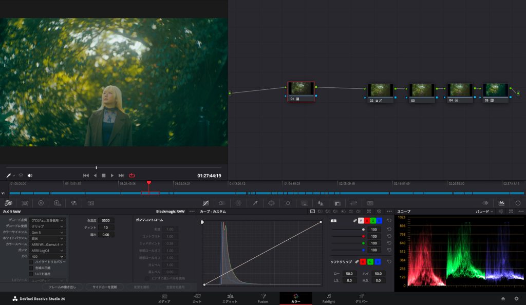 撮影した素材をDaVinci Resolveで開いてみます。森の中の木漏れ日とマジックアワーというシチュエーションでの撮影でしたが、期待した通りダイナミックレンジの広さと色の美しさがまず目を引きます。手持ちの多い撮影でしたが懸念していたローリングシャッターもそれほど気になることもありませんでした。