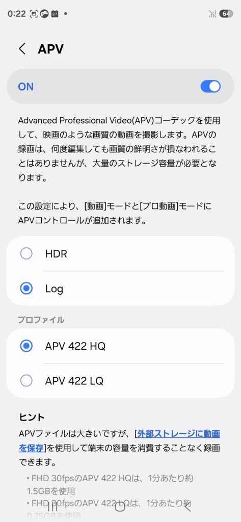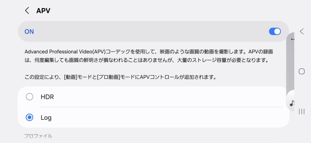APVはスマートフォンを起点とする動画制作におけるプロ用途の編集やカラーグレーディング耐性を持つコーデックとして、Samsungがクアルコムと共同開発した全く新しい動画コーデックです。iPhoneにも搭載され従来プロの動画制作においてメジャーであったProResとは異なり、最初からスマートフォンのSOCやストレージを活用することを前提に設計されており、イントラ圧縮、12bit色深度と 4:4:4 クロマ サブサンプリングに対応(ただしS26Ultraは4:2:2とのこと)、そしてProResに対して約10%のデータ軽量化を実現しています。