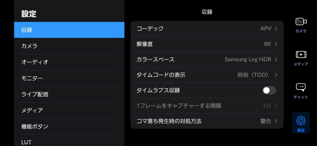 さてS26 Ultraのカメラ機能を見てみましょう。カメラアプリから入ると「動画」それと設定の奥に「プロ動画」という項目があります。「動画」設定でも「プロ動画」でも収録コーデックにAPVをチョイスすることが可能です。また、自分が普段スマホで動画を撮影するときによく活用する「Blackmagic Camera」アプリでも検証してみましたが、これも収録フォーマットでAPVを選択することが可能となっています。
